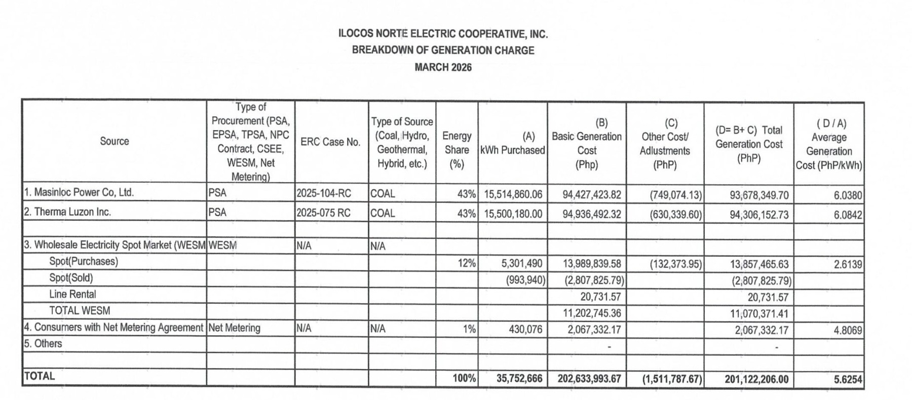 Breakdown of Generation Charge 2026